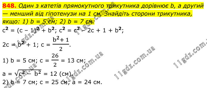 848. Один з катетів прямокутного трикутника дорівнює b, а другий — менший від гіпотенузи на 1 см. Знайдіть сторони трикутника, якщо: 1) b = 5 см; 2) b = 7 см. c2 = (с – 1)2 + b2; с2 = c2 – 2с + 1 + b2; 2с = b2 + 1; с = (b^2+ 1)/2. 1) b = 5 см; с = 26/2 = 13 см; а = √(c^2- b^2 ) = 12 (см). 2) b = 7 см; c = 25 см; а = 24 см.