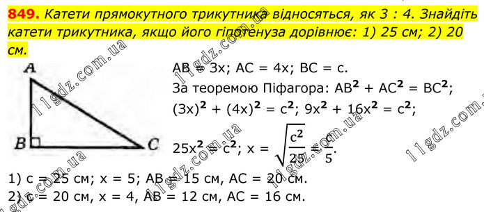 849. Катети прямокутного трикутника відносяться, як 3 : 4. Знайдіть катети трикутника, якщо його гіпотенуза дорівнює: 1) 25 см; 2) 20 см. АВ = Зх; АС = 4х; ВС = с. За теоремою Піфагора: AB2 + AC2 = BC2; (Зx)2 + (4x)2 = c2; 9x2 + 16x2 = c2; 25x2 = c2; x = √(c^2/25) = c/5. 1) c = 25 cм; x = 5; AB = 15 cм, AC = 20 cм. 2) c = 20 см, x = 4, AB = 12 cм, AC = 16 см.