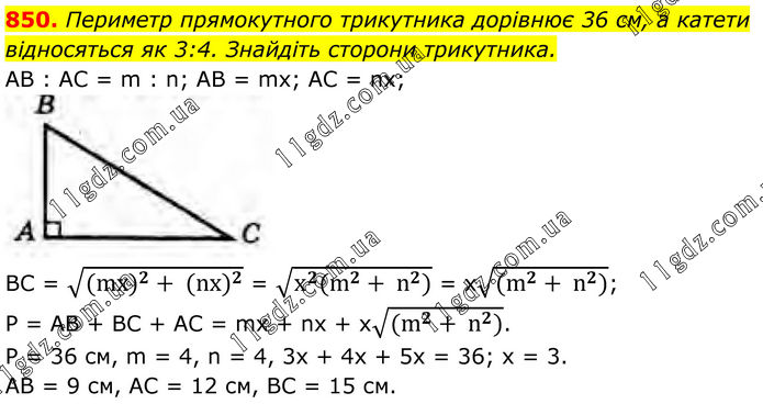 850. Периметр прямокутного трикутника дорівнює 36 см, а катети відносяться як 3:4. Знайдіть сторони трикутника. AB : AC = m : n; AB = mx; AC = nx; BC = √(〖(mx)〗^2+ 〖(nx)〗^2 ) = √(x^2 (m^2+ n^2)) = x√(〖(m〗^2+ n^2)); P = AB + BC + AC = mx + nx + x√(〖(m〗^2+ n^2)). P = 36 cм, m = 4, n = 4, 3x + 4x + 5x = 36; x = 3. АВ = 9 см, АС = 12 см, ВС = 15 см.