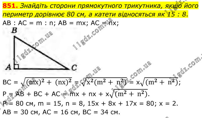 851. Знайдіть сторони прямокутного трикутника, якщо його периметр дорівнює 80 см, а катети відносяться як 15 : 8. AB : AC = m : n; AB = mx; AC = nx; BC = √(〖(mx)〗^2+ 〖(nx)〗^2 ) = √(x^2 (m^2+ n^2)) = x√(〖(m〗^2+ n^2)); P = AB + BC + AC = mx + nx + x√(〖(m〗^2+ n^2)). Р = 80 см, m = 15, n = 8, 15x + 8x + 17x = 80; x = 2. AB = 30 cм, AC = 16 cм, ВC = 34 cм.