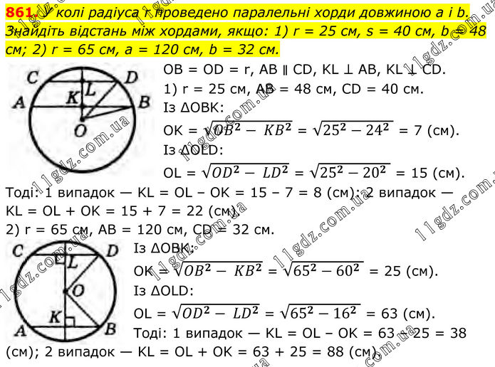 861. У колі радіуса r проведено паралельні хорди довжиною a і b. Знайдіть відстань між хордами, якщо: 1) r = 25 см, s = 40 см, b = 48 см; 2) r = 65 см, a = 120 см, b = 32 см. OB = OD = r, AB ∥ CD, KL ⊥ AB, KL ⊥ CD. 1) r = 25 см, AB = 48 см, CD = 40 см. Із ∆ОВK: OK = √(〖OB〗^2- 〖KB〗^2 ) = √(25^2-24^2 ) = 7 (см). Із ∆OLD: OL = √(〖OD〗^2- 〖LD〗^2 ) = √(25^2-20^2 ) = 15 (см). Тоді: 1 випадок — KL = OL – OK = 15 – 7 = 8 (см): 2 випадок — KL = OL + OK = 15 + 7 = 22 (cм). 2) r = 65 см, AВ = 120 см, CD = 32 см. Із ∆OBK: OK = √(〖OB〗^2- 〖KB〗^2 ) = √(65^2-60^2 ) = 25 (см). Із ∆ОLD: OL = √(〖OD〗^2- 〖LD〗^2 ) = √(65^2-16^2 ) = 63 (см). Тоді: 1 випадок — KL = OL – OK = 63 – 25 = 38 (см); 2 випадок — KL = OL + OK = 63 + 25 = 88 (см).