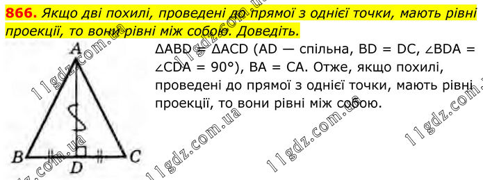 866. Якщо дві похилі, проведені до прямої з однієї точки, мають рівні проекції, то вони рівні між собою. Доведіть. ∆АBD = ∆ACD (AD — спільна, BD = DC, ∠BDA = ∠CDA = 90°), BA = CA. Отже, якщо похилі, проведені до прямої з однієї точки, мають рівні проекції, то вони рівні між собою.