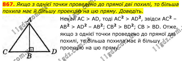 867. Якщо з однієї точки проведено до прямої дві похилі, то більша похила має й більшу проекцію на цю пряму. Доведіть. Нехай АС > AD, тоді AC2 > AD2, звідси АС2 – АВ2 > AD2 – АВ2; СВ2 > BD2; СВ > BD. Отже, якщо з однієї точки проведено до прямої дві похилі, то більша похила має й більшу проекцію на цю пряму.