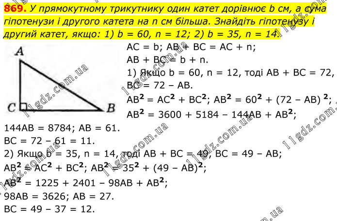 869. У прямокутному трикутнику один катет дорівнює b см, а сума гіпотенузи і другого катета на n см більша. Знайдіть гіпотенузу і другий катет, якщо: 1) b = 60, n = 12; 2) b = 35, n = 14. АС = b; AB + ВС = АС + n; AB + ВС = b + n. 1) Якщо b = 60, n = 12, тоді AB + ВС = 72, BC = 72 – AB. АВ2 = АС2 + ВС2; АВ2 = 602 + (72 – АВ)2; АВ2 = 3600 + 5184 – 144АВ + АВ2; 144АВ = 8784; АВ = 61. ВС = 72 – 61 = 11. 2) Якщо b = 35, n = 14, тоді АВ + ВС = 49, ВС = 49 – AB; АВ2 = АС2 + ВС2; АВ2 = 352 + (49 – АВ)2; АВ2 = 1225 + 2401 – 98АВ + АВ2; 98АВ = 3626; АВ = 27. ВС = 49 – 37 = 12.