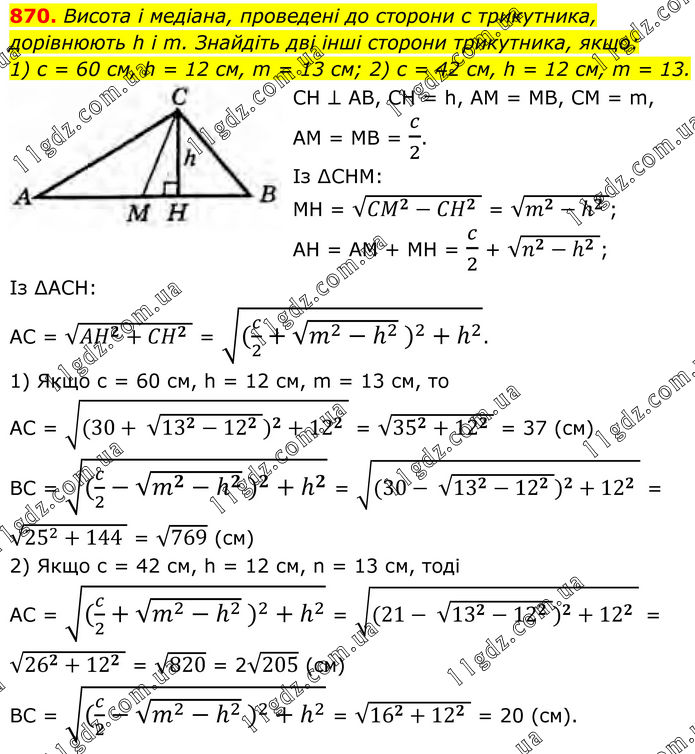 870. Висота і медіана, проведені до сторони с трикутника, дорівнюють h і m. Знайдіть дві інші сторони трикутника, якщо: 1) с = 60 см, h = 12 см, m = 13 см; 2) с = 42 см, h = 12 см, m = 13. CH ⊥ AB, CH = h, AM = MB, CM = m, AM = MB = c/2. Із ∆CHM: MH = √(〖CM〗^2-〖CH〗^2 ) = √(m^2-h^2 ); AH = AM + MH = c/2 + √(n^2-h^2 ); Із ∆АСH: АС = √(〖AH〗^2+〖CH〗^2 ) = √((c/2+√(m^2-h^2 ) )^2+h^2 ). 1) Якщо с = 60 см, h = 12 см, m = 13 cм, то AC = √((30+ √(13^2-12^2 ) )^2+12^2 ) = √(35^2+12^2 ) = 37 (cм). ВС = √((c/2-√(m^2-h^2 ) )^2+h^2 ) = √((30- √(13^2-12^2 ) )^2+12^2 ) = √(25^2+144 ) = √769 (cм). 2) Якщо с = 42 см, h = 12 см, n = 13 см, тоді AC = √((c/2+√(m^2-h^2 ) )^2+h^2 ) = √((21- √(13^2-12^2 ) )^2+12^2 ) = √(26^2+12^2 ) = √820 = 2√205 (cм). BC = √((c/2-√(m^2-h^2 ) )^2+h^2 ) = √(16^2+12^2 ) = 20 (cм).
