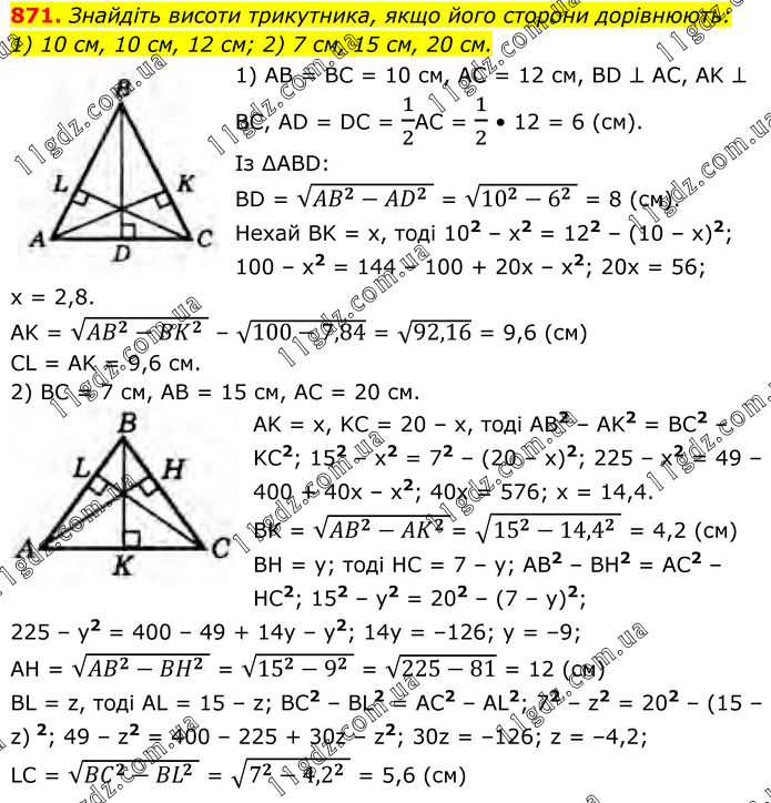871. Знайдіть висоти трикутника, якщо його сторони дорівнюють: 1) 10 см, 10 см, 12 см; 2) 7 см, 15 см, 20 см. 1) AB = ВC = 10 cм, AC = 12 cм, BD ⊥ AС, AK ⊥ BC, АD = DС = 1/2AС = 1/2 • 12 = 6 (см). Із ∆АВD: BD = √(〖AB〗^2-〖AD〗^2 ) = √(10^2-6^2 ) = 8 (см). Нехай BK = x, тоді 102 – x2 = 122 – (10 – x)2; 100 – x2 = 144 – 100 + 20x – x2; 20x = 56; x = 2,8. AK = √(〖AB〗^2-〖BK〗^2 ) – √(100-7,84) = √92,16 = 9,6 (см). CL = AK = 9,6 cм. 2) BC = 7 cм, AB = 15 cм, AC = 20 см. AK = x, KC = 20 – x, тоді AB2 – AK2 = BC2 – KС2; 152 – x2 = 72 – (20 – x)2; 225 – x2 = 49 – 400 + 40x – x2; 40x = 576; х = 14,4. ВК = √(〖AB〗^2-〖AK〗^2 )= √(15^2-〖14,4〗^2 ) = 4,2 (см). ВH = у; тоді HС = 7 – у; AB2 – BH2 = АС2 – HС2; 152 – y2 = 202 – (7 – y)2; 225 – y2 = 400 – 49 + 14у – y2; 14y = –126; y = –9; АH = √(〖AB〗^2-〖BH〗^2 ) = √(15^2-9^2 ) = √(225-81) = 12 (см). BL = z, тоді АL = 15 – z; BC2 – BL2 = AC2 – AL2; 72 – z2 = 202 – (15 – z) 2; 49 – z2 = 400 – 225 + 30z – z2; 30z = –126; z = –4,2; LC = √(〖BC〗^2-〖BL〗^2 ) = √(7^2-〖4,2〗^2 ) = 5,6 (см).