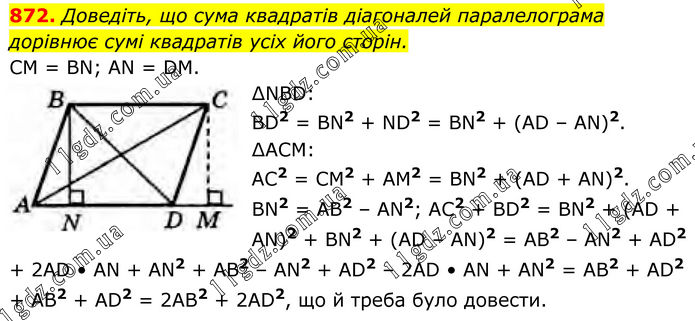 872. Доведіть, що сума квадратів діагоналей паралелограма дорівнює сумі квадратів усіх його сторін. CM = BN; AN = DM. ∆NBD: BD2 = BN2 + ND2 = BN2 + (АD – AN)2. ∆ACM: AC2 = CM2 + AM2 = BN2 + (АD + AN)2. BN2 = AB2 – АN2; AC2 + BD2 = BN2 + (AD + AN)2 + BN2 + (AD – AN)2 = AB2 – AN2 + AD2 + 2AD • AN + AN2 + AB2 – AN2 + AD2 – 2AD • AN + AN2 = AB2 + AD2 + AB2 + AD2 = 2AB2 + 2AD2, що й треба було довести.