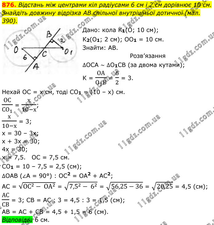 876. Відстань між центрами кіл радіусами 6 см і 2 см дорівнює 10 см. Знайдіть довжину відрізка AB спільної внутрішньої дотичної (мал. 390). Дано: кола К1(О; 10 см); К2(О1; 2 см); ОО1 = 10 см. Знайти: АВ. Розв’язання ∆ОСА ~ ∆О1СВ (за двома кутами); К = ОА/(О_1 В) = 6/2 = 3. Нехай ОС = х см, тоді СО1 = (10 – х) см. ОС/〖СО〗_1 = х/(10-х); х/(10-х) = 3; х = 30 – 3х; х + 3х = 30; 4х = 30; х = 7,5. ОС = 7,5 см. СО1 = 10 – 7,5 = 2,5 (см); ∆ОАВ (∠А = 90°) : ОС2 = ОА2 + АС2; АС = √(〖ОС〗^2- 〖ОА〗^2 ) = √(〖7,5〗^2- 6^2 ) = √(56,25-36) = √20,25 = 4,5 (см); АС/СВ = 3; СВ = АС : 3 = 4,5 : 3 = 1,5 (см); АВ = АС + СВ = 4,5 + 1,5 = 6 (см). Відповідь: 6 см.