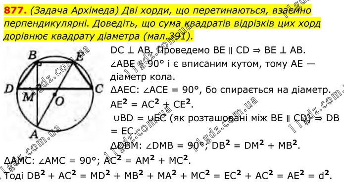 877. (Задача Архімеда) Дві хорди, що перетинаються, взаємно перпендикулярні. Доведіть, що сума квадратів відрізків цих хорд дорівнює квадрату діаметра (мал.391). DC ⊥ AB. Проведемо BE ∥ CD ⇒ BE ⊥ АВ. ∠ABE – 90° і є вписаним кутом, тому АЕ — діаметр кола. ∆АЕС: ∠ACE = 90°, бо спирається на діаметр. АЕ2 = АС2 + СE2. ∪BD = ∪EC (як розташовані між BE ∥ CD) ⇒ DB = EC. ∆DBM: ∠DMB = 90°; DB2 = DM2 + MB2. ∆AMC: ∠AMC = 90°; AC2 = AM2 + MC2. Тоді DB2 + AC2 = MD2 + MB2 + MA2 + MC2 = EC2 + AC2 = AE2 = d2.
