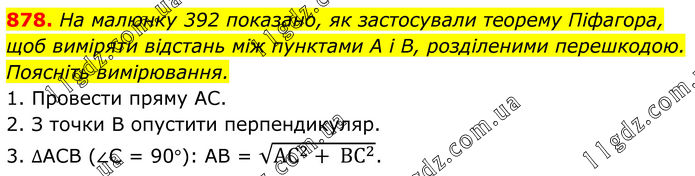 878. На малюнку 392 показано, як застосували теорему Піфагора, щоб виміряти відстань між пунктами А і В, розділеними перешкодою. Поясніть вимірювання. 1. Провести пряму АС. 2. З точки В опустити перпендикуляр. 3. ∆АСВ (∠С = 90°): АВ = √(〖АС〗^2+ 〖ВС〗^2 ).