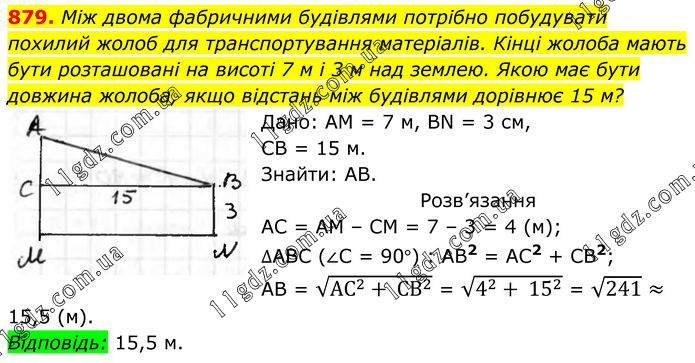 879. Між двома фабричними будівлями потрібно побудувати похилий жолоб для транспортування матеріалів. Кінці жолоба мають бути розташовані на висоті 7 м і 3 м над землею. Якою має бути довжина жолоба, якщо відстань між будівлями дорівнює 15 м? Дано: АМ = 7 м, BN = 3 см, СВ = 15 м. Знайти: АВ. Розв’язання АС = АМ – СМ = 7 – 3 = 4 (м); ∆АВС (∠С = 90°) : АВ2 = АС2 + СВ2; АВ = √(〖АС〗^2+ 〖СВ〗^2 ) = √(4^2+ 15^2 ) = √241 ≈ 15,5 (м). Відповідь: 15,5 м.