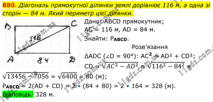 880. Діагональ прямокутної ділянки землі дорівнює 116 м, а одна зі сторін — 84 м. Який периметр цієї ділянки. Дано: ABCD прямокутник; AC = 116 м, AD = 84 м. Знайти: РABCD. Розв’язання ∆ADC (∠D = 90°): АС2 = AD² + CD²; CD = √(〖AC〗^2-〖AD〗^2 ) = √(116^2-84^2 ) = √(13456-7056) = √6400 = 80 (м); РABCD = 2(AD + CD) = 2 • (84 + 80) = 2 • 164 = 328 (м). Відповідь: 328 м.