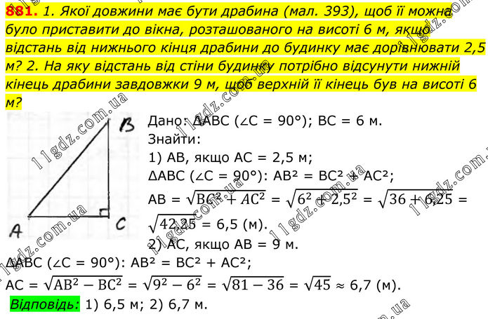 881. 1. Якої довжини має бути драбина (мал. 393), щоб її можна було приставити до вікна, розташованого на висоті 6 м, якщо відстань від нижнього кінця драбини до будинку має дорівнювати 2,5 м? 2. На яку відстань від стіни будинку потрібно відсунути нижній кінець драбини завдовжки 9 м, щоб верхній її кінець був на висоті 6 м? Дано: ∆АВС (∠С = 90°); ВС = 6 м. Знайти: 1) AB, якщо AC = 2,5 м; ∆АВС (∠С = 90°): АВ² = ВС² + АС²; АВ = √(〖ВC〗^2+〖AС〗^2 ) = √(6^2+〖2,5〗^2 ) = √(36+6,25) = √42,25 = 6,5 (м). 2) АС, якщо AB = 9 м. ∆АВС (∠С = 90°): АВ² = ВС² + АС²; АС = √(〖АВ〗^2-〖ВС〗^2 ) = √(9^2-6^2 ) = √(81-36) = √45 ≈ 6,7 (м). Відповідь: 1) 6,5 м; 2) 6,7 м.