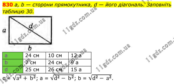 830 a, b — сторони прямокутника, d — його діагональ. Заповніть таблицю 30. a 24 см 10 см 12 а b 7 см 24 см 9 а d 25 см 26 см 15 а с = √(a^2+ b^2 ); a = √(d^2- b^2 ); b = √(d^2- a^2 ).