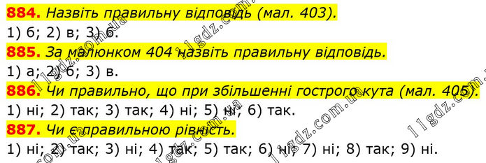 884. Назвіть правильну відповідь (мал. 403). 1) б; 2) в; 3) б. 885. За малюнком 404 назвіть правильну відповідь. 1) а; 2) б; 3) в. 886. Чи правильно, що при збільшенні гострого кута (мал. 405). 1) ні; 2) так; 3) так; 4) ні; 5) ні; 6) так. 887. Чи є правильною рівність. 1) ні; 2) так; 3) ні; 4) так; 5) так; 6) ні; 7) ні; 8) так; 9) ні.