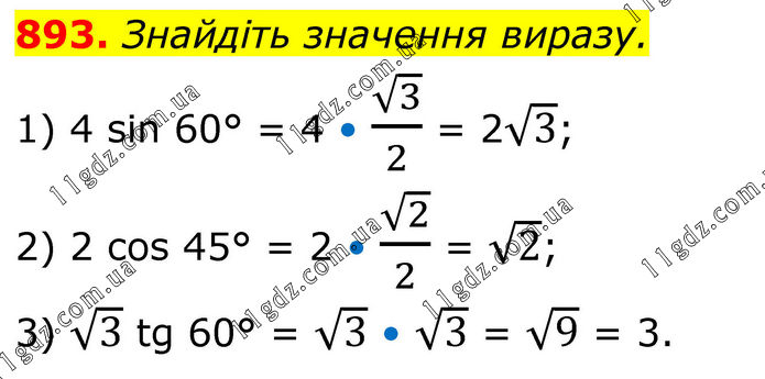 893. Знайдіть значення виразу. 1) 4 sin 60° = 4 • √3/2 = 2√3; 2) 2 cos 45° = 2 • √2/2 = √2; 3) √3 tg 60° = √3 • √3 = √9 = 3.