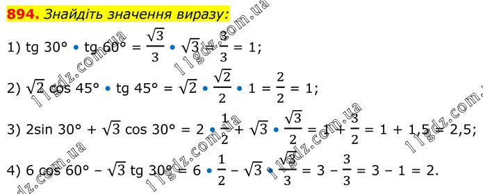 894. Знайдіть значення виразу: 1) tg 30° • tg 60° = √3/3 • √3 = 3/3 = 1; 2) √2 cos 45° • tg 45° = √2 • √2/2 • 1 = 2/2 = 1; 3) 2sin 30° + √3 cos 30° = 2 • 1/2 + √3 • √3/2 = 1 + 3/2 = 1 + 1,5 = 2,5; 4) 6 cos 60° – √3 tg 30° = 6 • 1/2 – √3 • √3/3 = 3 – 3/3 = 3 – 1 = 2.