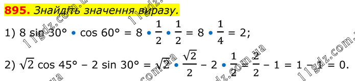895. Знайдіть значення виразу. 1) 8 sin 30° • cos 60° = 8 • 1/2 • 1/2 = 8 • 1/4 = 2; 2) √2 cos 45° – 2 sin 30° = √2 • √2/2 – 2 • 1/2 = 2/2 – 1 = 1 – 1 = 0.