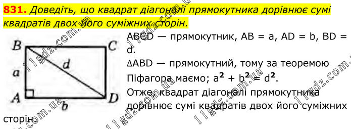 831. Доведіть, що квадрат діагоналі прямокутника дорівнює сумі квадратів двох його суміжних сторін. ABCD — прямокутник, AB = a, AD = b, BD = d. ∆ABD — прямокутний, тому за теоремою Піфагора маємо; а2 + b2 = d2. Отже, квадрат діагоналі прямокутника дорівнює сумі квадратів двох його суміжних сторін.