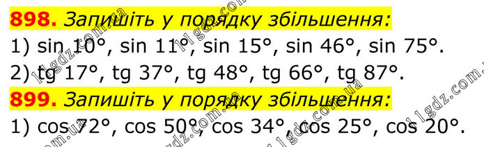 898. Запишіть у порядку збільшення: 1) sin 10°, sin 11°, sin 15°, sin 46°, sin 75°. 2) tg 17°, tg 37°, tg 48°, tg 66°, tg 87°. 899. Запишіть у порядку збільшення: 1) cos 72°, cos 50°, cos 34°, cos 25°, cos 20°.