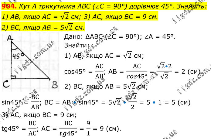 904. Кут А трикутника ABC (∠C = 90°) дорівнює 45°. Знайдіть: 1) AB, якщо AC = √2 см; 3) AC, якщо BC = 9 см. 2) BC, якщо AB = 5√2 см. Дано: ∆АВС (∠С = 90°); ∠А = 45°. Знайти: 1) АВ, якщо АС = √2 см; cos45° = АС/АВ; AB = АС/(cos45°) = (√2•2)/√2 = 2 (см). 2) ВС, якщо АВ = 5√2 см; sin45° = ВС/АВ; BC = AB • sin45° = 5√2 • √2/2 = 5 • 1 = 5 (см) 3) АС, якщо ВС = 9 см; tg45° = ВС/АС; AC = ВС/(tg45°) = 9/1 = 9 (см).