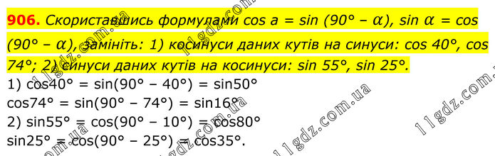 906. Скориставшись формулами cos а = sin (90° – α), sin α = cos (90° – α), замініть: 1) косинуси даних кутів на синуси: cos 40°, cos 74°; 2) синуси даних кутів на косинуси: sin 55°, sin 25°. 1) cos40° = sin(90° – 40°) = sin50°; cos74° = sin(90° – 74°) = sin16°. 2) sin55° = cos(90° – 10°) = cos80°; sin25° = cos(90° – 25°) = cos35°.