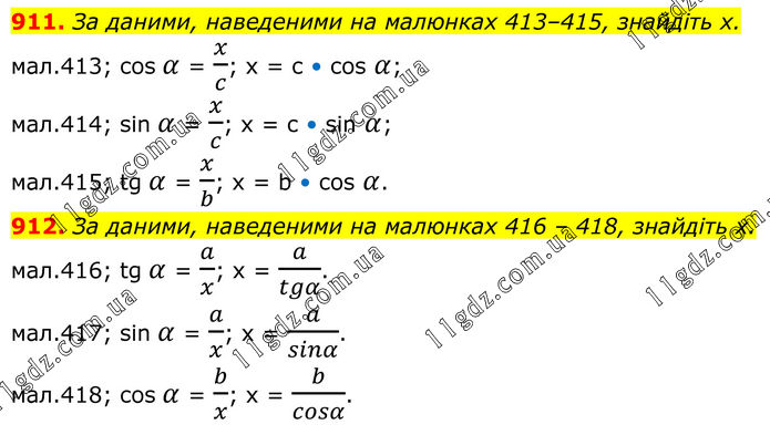 911. За даними, наведеними на малюнках 413–415, знайдіть х. мал.413; cos α = x/c; x = c • cos α; мал.414; sin α = x/c; x = c • sin α; мал.415; tg α = x/b; x = b • cos α. 912. За даними, наведеними на малюнках 416 – 418, знайдіть х. мал.416; tg α = a/x; x = a/tgα. мал.417; sin α = a/x; x = a/sinα. мал.418; cos α = b/x; x = b/cosα.