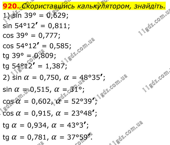 920. Cкориставшись калькулятором, знайдіть. 1) sin 39° = 0,629; sin 54°12’ = 0,811; cos 39° = 0,777; cos 54°12’ = 0,585; tg 39° = 0,809; tg 54°12’ = 1,387; 2) sin α = 0,750, α = 48°35’; sin α = 0,515, α = 31°; cos α = 0,602, α = 52°39’; cos α = 0,915, α = 23°48’; tg α = 0,934, α = 43°3’; tg α = 0,781, α = 37°59’.