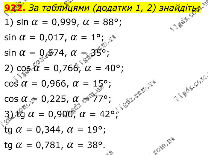 922. За таблицями (додатки 1, 2) знайдіть: 1) sin α = 0,999, α = 88°; sin α = 0,017, α = 1°; sin α = 0,574, α = 35°; 2) cos α = 0,766, α = 40°; cos α = 0,966, α = 15°; cos α = 0,225, α = 77°; 3) tg α = 0,900, α = 42°; tg α = 0,344, α = 19°; tg α = 0,781, α = 38°.