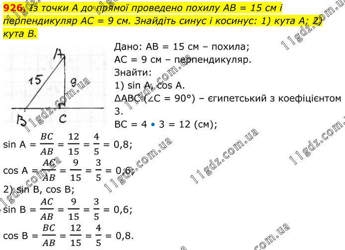 926. Із точки А до прямої проведено похилу AB = 15 см і перпендикуляр AC = 9 см. Знайдіть синус і косинус: 1) кута А; 2) кута B. Дано: АВ = 15 см – похила; АС = 9 см – перпендикуляр. Знайти: 1) sin A, cos A. ∆ABC (∠С = 90°) – єгипетський з коефіцієнтом 3. ВС = 4 • 3 = 12 (см); sin A = BC/AB = 12/15 = 4/5 = 0,8; cos A = AC/AB = 9/15 = 3/5 = 0,6; 2) sin B, cos B; sin B = AC/AB = 9/15 = 3/5 = 0,6; cos B = BC/AB = 12/15 = 4/5 = 0,8.