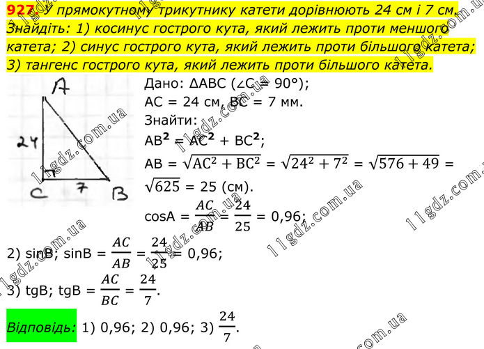 927. У прямокутному трикутнику катети дорівнюють 24 см і 7 см. Знайдіть: 1) косинус гострого кута, який лежить проти меншого катета; 2) синус гострого кута, який лежить проти більшого катета; 3) тангенс гострого кута, який лежить проти більшого катета. Дано: ∆АВС (∠С = 90°); АС = 24 см, ВС = 7 мм. Знайти: АВ2 = АС2 + ВС2; АВ = √(〖АС〗^2+〖ВС〗^2 ) = √(24^2+7^2 ) = √(576+49) = √625 = 25 (см). cosA = AC/AB = 24/25 = 0,96; 2) sinB; sinB = AC/AB = 24/25 = 0,96; 3) tgB; tgB = AC/BC = 24/7. Відповідь: 1) 0,96; 2) 0,96; 3) 24/7.