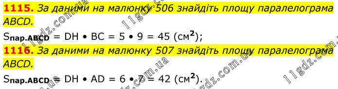 1115. За даними на малюнку 506 знайдіть площу паралелограма ABCD. Sпар.ABCD = DH • BC = 5 • 9 = 45 (см2); 1116. За даними на малюнку 507 знайдіть площу паралелограма ABCD. Sпар.ABCD = DH • AD = 6 • 7 = 42 (см2).