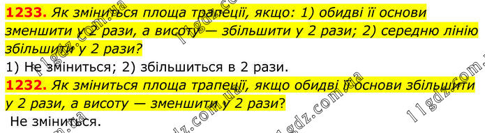 1231. Як зміниться площа трапеції, якщо: 1) обидві її основи зменшити у 2 рази, а висоту — збільшити у 2 рази; 2) середню лінію збільшити у 2 рази? 1) Не зміниться; 2) збільшиться в 2 рази. 1232. Як зміниться площа трапеції, якщо обидві її основи збільшити у 2 рази, а висоту — зменшити у 2 рази? Не зміниться.