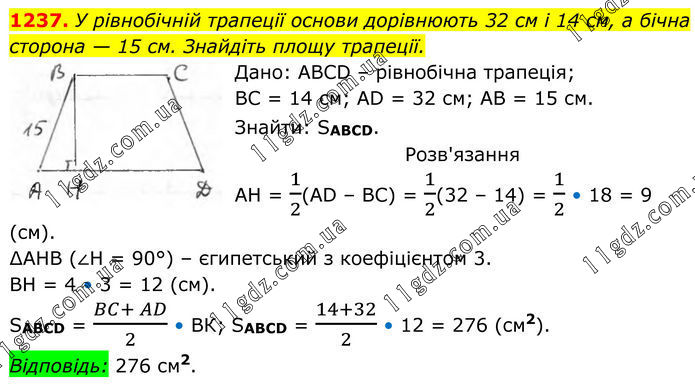 1237. У рівнобічній трапеції основи дорівнюють 32 см і 14 см, а бічна сторона — 15 см. Знайдіть площу трапеції. Дано: ABCD – рівнобічна трапеція; ВС = 14 см; AD = 32 см; АВ = 15 см. Знайти: SABCD. Розв'язання АН = 1/2(AD – BC) = 1/2(32 – 14) = 1/2 • 18 = 9 (см). ∆АНВ (∠Н = 90°) – єгипетський з коефіцієнтом 3. ВН = 4 • 3 = 12 (см). SABCD = (BC+ AD)/2 • BК; SABCD = (14+32)/2 • 12 = 276 (см2). Відповідь: 276 см2.