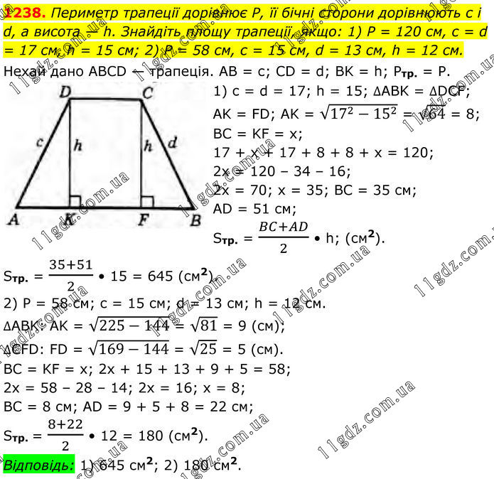 1238. Периметр трапеції дорівнює Р, її бічні сторони дорівнюють с і d, а висота — h. Знайдіть площу трапеції, якщо: 1) P = 120 см, с = d = 17 см, h = 15 см; 2) P = 58 см, с = 15 см, d = 13 см, h = 12 см. Нехай дано ABCD — трапеція. AB = с; CD = d; BK = h; Ртр. = P. 1) c = d = 17; h = 15; ∆ABK = ∆DCF; АK = FD; AK = √(17^2-15^2 ) = √64 = 8; BC = KF = x; 17 + x + 17 + 8 + 8 + x = 120; 2x = 120 – 34 – 16; 2x = 70; x = 35; BC = 35 см; AD = 51 см; Sтр. = (BC+AD)/2 • h; (см2). Sтр. = (35+51)/2 • 15 = 645 (см2). 2) P = 58 cм; c = 15 cм; d = 13 см; h = 12 см. ∆ABK: AK = √(225-144) = √81 = 9 (cм); ∆CFD: FD = √(169-144) = √25 = 5 (cм). BC = KF = x; 2x + 15 + 13 + 9 + 5 = 58; 2x = 58 – 28 – 14; 2x = 16; x = 8; ВС = 8 см; AD = 9 + 5 + 8 = 22 см; Sтр. = (8+22)/2 • 12 = 180 (см2). Відповідь: 1) 645 см2; 2) 180 см2.