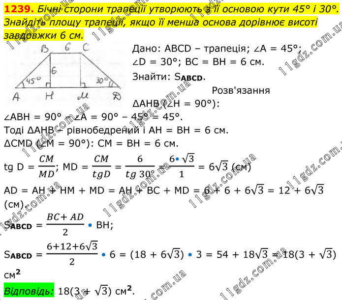 1239. Бічні сторони трапеції утворюють з її основою кути 45° і 30°. Знайдіть площу трапеції, якщо її менша основа дорівнює висоті завдовжки 6 см. Дано: ABCD – трапеція; ∠A = 45°; ∠D = 30°; BC = BH = 6 см. Знайти: SABCD. Розв'язання ∆АНВ (∠Н = 90°): ∠АВН = 90° – ∠А = 90° – 45° = 45°. Тоді ∆АНВ – рівнобедрений і АН = ВН = 6 см. ∆CMD (∠M = 90°): CM = BH = 6 см. tg D = CM/MD; MD = CM/tgD = 6/(tg 30°) = (6• √3)/1 = 6√3 (см). AD = AH + HM + MD = AH + BC + MD = 6 + 6 + 6√3 = 12 + 6√3 (см). SABCD = (BC+ AD)/2 • BH; SABCD = (6+12+6√3)/2 • 6 = (18 + 6√3) • 3 = 54 + 18√3 = 18(3 + √3) см2. Відповідь: 18(3 + √3) см2.