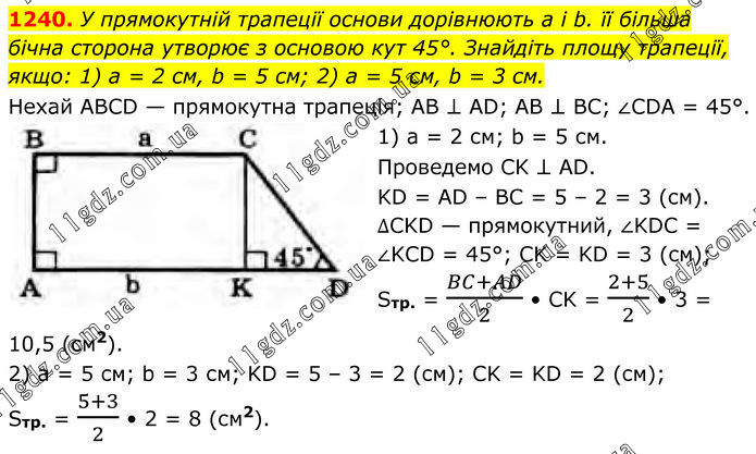 1240. У прямокутній трапеції основи дорівнюють a і b. її більша бічна сторона утворює з основою кут 45°. Знайдіть площу трапеції, якщо: 1) a = 2 см, b = 5 см; 2) a = 5 см, b = 3 см. Нехай АВСD — прямокутна трапеція; AB ⊥ AD; AB ⊥ ВС; ∠CDA = 45°. 1) а = 2 см; b = 5 см. Проведемо CK ⊥ AD. KD = AD – BC = 5 – 2 = 3 (см). ∆CKD — прямокутний, ∠KDC = ∠KCD = 45°; CK = KD = 3 (cм); Sтр. = (BC+AD)/2 • CK = (2+5)/2 • 3 = 10,5 (см2). 2) а = 5 cм; b = 3 см; KD = 5 – 3 = 2 (см); CK = KD = 2 (см); Sтр. = (5+3)/2 • 2 = 8 (см2).
