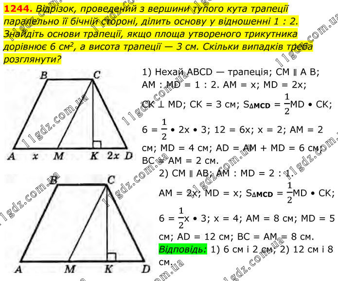 1244. Відрізок, проведений з вершини тупого кута трапеції паралельно її бічній стороні, ділить основу у відношенні 1 : 2. Знайдіть основи трапеції, якщо площа утвореного трикутника дорівнює 6 см2, а висота трапеції — 3 см. Скільки випадків треба розглянути? 1) Нехай ABCD — трапеція; CM ∥ A B; AM : MD = 1 : 2. AM = x; MD = 2x; CK ⊥ MD; CK = З cм; S∆MCD = 1/2MD • CK; 6 = 1/2 • 2x • 3; 12 = 6x; x = 2; AM = 2 см; MD = 4 cм; AD = AM + MD = 6 cм; BC = AM = 2 см. 2) CM ∥ AB; AM : MD = 2 : 1. AM = 2x; MD = x; S∆MCD = 1/2MD • CK; 6 = 1/2x • 3; x = 4; AM = 8 cм; MD = 5 см; AD = 12 cм; BC = AM = 8 см. Відповідь: 1) 6 см і 2 см; 2) 12 см і 8 см.