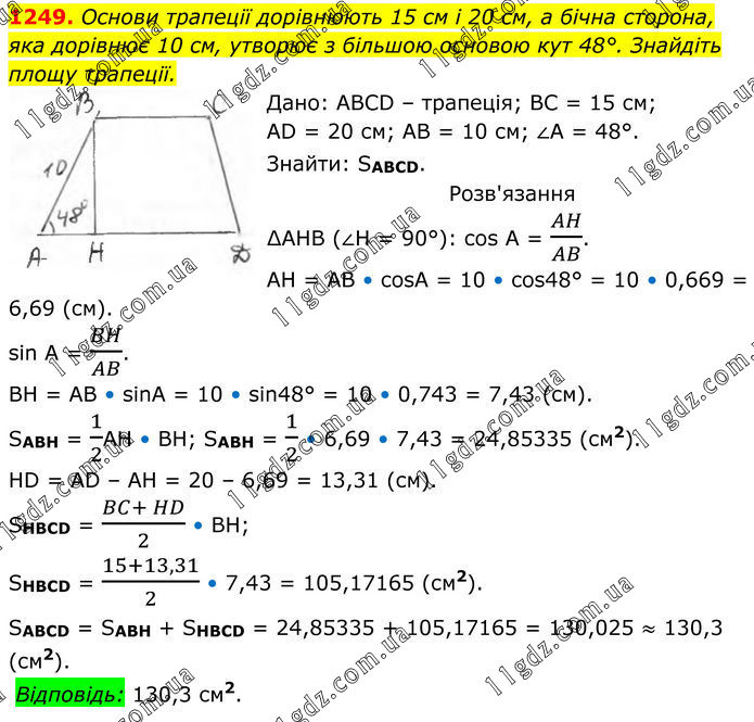 1249. Основи трапеції дорівнюють 15 см і 20 см, а бічна сторона, яка дорівнює 10 см, утворює з більшою основою кут 48°. Знайдіть площу трапеції. Дано: ABCD – трапеція; ВС = 15 см; AD = 20 см; АВ = 10 см; ∠A = 48°. Знайти: SABCD. Розв'язання ∆АНВ (∠Н = 90°): cos A = AH/AB. AH = AB • cosA = 10 • cos48° = 10 • 0,669 = 6,69 (см). sin A = BH/AB. BH = AB • sinA = 10 • sin48° = 10 • 0,743 = 7,43 (см). SABH = 1/2AH • BH; SABH = 1/2 • 6,69 • 7,43 = 24,85335 (см2). HD = AD – AH = 20 – 6,69 = 13,31 (см). SHBCD = (BC+ HD)/2 • BH; SHBCD = (15+13,31)/2 • 7,43 = 105,17165 (см2). SABCD = SABH + SHBCD = 24,85335 + 105,17165 = 130,025 ≈ 130,3 (см2). Відповідь: 130,3 см2.