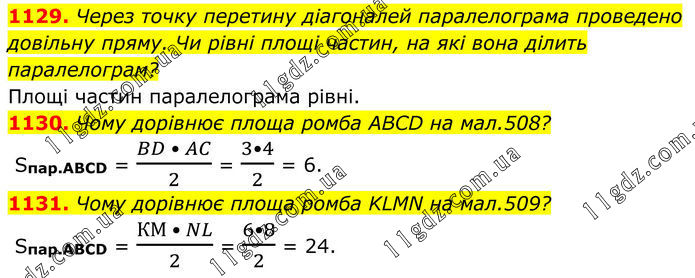 1129. Через точку перетину діагоналей паралелограма проведено довільну пряму. Чи рівні площі частин, на які вона ділить паралелограм? Площі частин паралелограма рівні. 1130. Чому дорівнює площа ромба ABCD на мал.508? Sпар.ABCD = (BD • AC)/2 = (3•4)/2 = 6. 1131. Чому дорівнює площа ромба KLMN на мал.509? Sпар.ABCD = (КМ • NL)/2 = (6•8)/2 = 24.