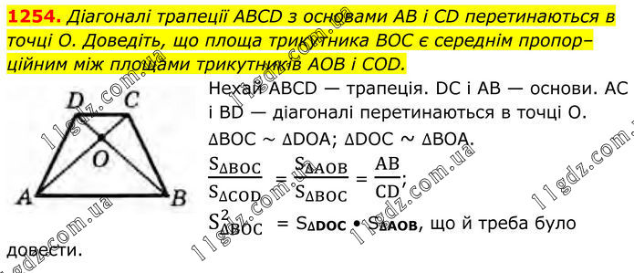1254. Діагоналі трапеції ABCD з основами AB і CD перетинаються в точці О. Доведіть, що площа трикутника BOC є середнім пропор–ційним між площами трикутників AOB і COD. Нехай ABCD — трапеція. DC і AB — основи. AC і BD — діагоналі перетинаються в точці О. ∆BOC ~ ∆DOA; ∆DOC ~ ∆BOA. S_∆BOC/S_∆COD = S_∆AOB/S_∆BOC = AB/CD; S_∆BOC^2 = S∆DOC • S∆AOB, що й треба було довести.