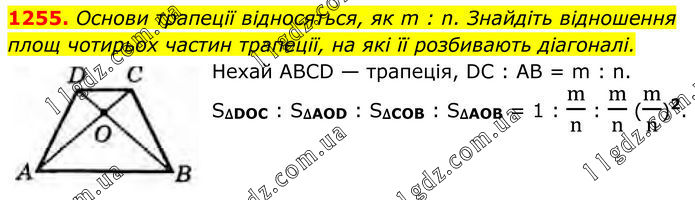 1255. Основи трапеції відносяться, як m : n. Знайдіть відношення площ чотирьох частин трапеції, на які її розбивають діагоналі. Нехай ABCD — трапеція, DC : AB = m : n. S∆DOC : S∆AOD : S∆COB : S∆AOB = 1 : m/n : m/n (m/n)2.