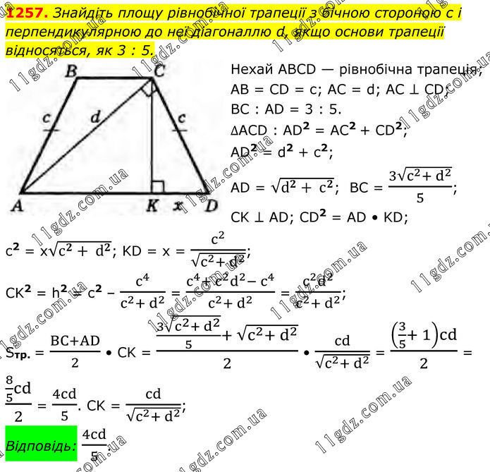 1257. Знайдіть площу рівнобічної трапеції з бічною стороною с і перпендикулярною до неї діагоналлю d, якщо основи трапеції відносяться, як 3 : 5. Нехай ABCD — рівнобічна трапеція; AB = CD = с; AC = d; AC ⊥ CD; ВС : AD = 3 : 5. ∆ACD : AD2 = AC2 + CD2; AD2 = d2 + c2; AD = √(d^2+ c^2 ); BC = (3√(c^2+ d^2 ))/5; CK ⊥ AD; CD2 = AD • KD; c2 = x√(c^2+ d^2 ); KD = x = c^2/√(c^2+ d^2 ); CK2 = h2 = c2 – c^4/(c^2+ d^2 ) = (c^4+ c^2 d^2- c^4)/(c^2+ d^2 ) = (c^2 d^2)/(c^2+ d^2 ); Sтр. = (BC+AD)/2 • CK = ((3√(c^2+ d^2 ))/5+ √(c^2+ d^2 ))/2 • cd/√(c^2+ d^2 ) = (3/5+ 1)cd/2 = (8/5 cd)/2 = 4cd/5. CK = cd/√(c^2+ d^2 ); Відповідь: 4cd/5.