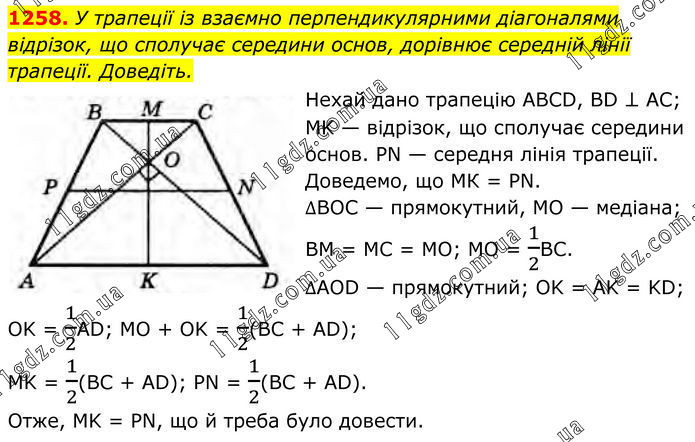 1258. У трапеції із взаємно перпендикулярними діагоналями відрізок, що сполучає середини основ, дорівнює середній лінії трапеції. Доведіть. Нехай дано трапецію ABCD, BD ⊥ AC; MK — відрізок, що сполучає середини основ. PN — середня лінія трапеції. Доведемо, що МК = PN. ∆ВОС — прямокутний, МО — медіана; ВМ = МС = МО; МО = 1/2ВС. ∆AOD — прямокутний; OK = AK = KD; OK = 1/2AD; MO + OK = 1/2(BC + AD); MK = 1/2(BC + AD); PN = 1/2(BC + AD). Отже, MK = PN, що й треба було довести.