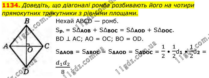 1134. Доведіть, що діагоналі ромба розбивають його на чотири прямокутних трикутники з рівними площами. Нехай ABCD — ромб. Sp. = S∆AOB + S∆BOC = S∆AOD + S∆DOC. BD ⊥ AC; AO = OC; BO = OD. S∆AOB = S∆BOC = S∆AOD = S∆DOC = 1/2 • 1/2d1 • 1/2d2 = (d_1 d_2)/8.