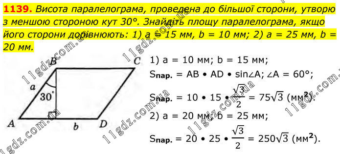 1139. Висота паралелограма, проведена до більшої сторони, утворю з меншою стороною кут 30°. Знайдіть площу паралелограма, якщо його сторони дорівнюють: 1) a = 15 мм, b = 10 мм; 2) a = 25 мм, b = 20 мм. 1) a = 10 мм; b = 15 мм; Sпар. = AB • AD • sin∠A; ∠A = 60°; Sпap. = 10 • 15 • √3/2 = 75√3 (мм2). 2) a = 20 мм; b = 25 мм; Sпаp. = 20 • 25 • √3/2 = 250√3 (мм2).