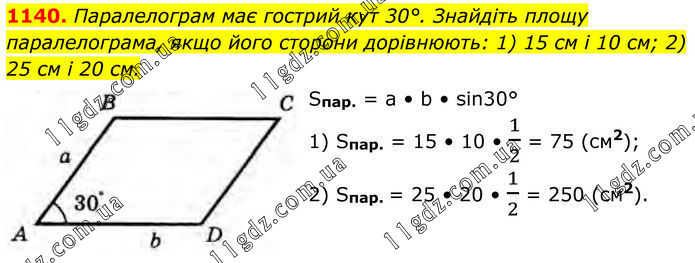 1140. Паралелограм має гострий кут 30°. Знайдіть площу паралелограма, якщо його сторони дорівнюють: 1) 15 см і 10 см; 2) 25 см і 20 см. Sпар. = a • b • sin30° 1) Sпар. = 15 • 10 • 1/2 = 75 (см2); 2) Sпар. = 25 • 20 • 1/2 = 250 (см2).