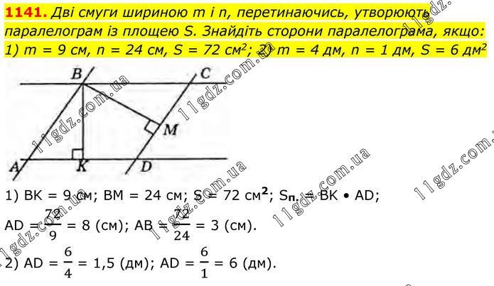 1141. Дві смуги шириною m і n, перетинаючись, утворюють паралелограм із площею S. Знайдіть сторони паралелограма, якщо: 1) m = 9 см, n = 24 см, S = 72 см2; 2) m = 4 дм, n = 1 дм, S = 6 дм2 1) BK = 9 cм; BM = 24 cм; S = 72 cм2; Sп. = BK • AD; AD = 72/9 = 8 (см); AB = 72/24 = 3 (см). 2) AD = 6/4 = 1,5 (дм); AD = 6/1 = 6 (дм).