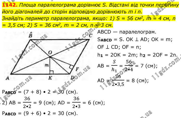 1142. Площа паралелограма дорівнює S. Відстані від точки перетину його діагоналей до сторін відповідно дорівнюють m і n. Знайдіть периметр паралелограма, якщо: 1) S = 56 см2, m = 4 см, n = 3,5 см; 2) S = 36 см2, m = 2 см, n = 3 см. ABCD — паралелограм. SABCD = S. OK ⊥ AD; OK = m; OF ⊥ CD; OF = n; h1 = 2ОK = 2m; h2 = 2OF = 2n. AB = S/h_1 = 56/(2•4) = 7 (см); AD = 56/(2•3,5) = 8 (см); PABCD = (7 + 8) • 2 = 30 (см). 2) AB = 36/(2•2) = 9 (см); AD = 36/(2•3) = 6 (cм); PABCD = (9 + 6) • 2 = 30 (см).