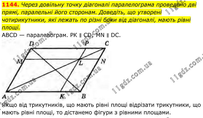 1144. Через довільну точку діагоналі паралелограма проведено дві прямі, паралельні його сторонам. Доведіть, що утворені чотирикутники, які лежать по різні боки від діагоналі, мають рівні площі. ABCD — паралелограм. РК ∥ CD; MN ∥ DC. Якщо від трикутників, що мають рівні площі відрізати трикутники, що мають рівні площі, то дістанемо фігури з рівними площами.